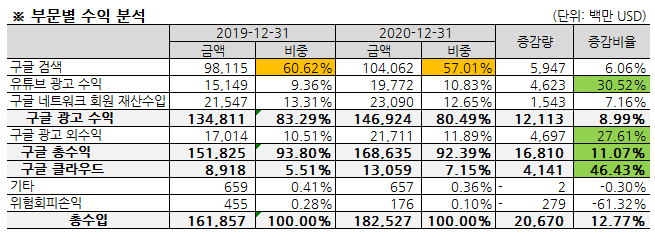그리고 총 매출은 2019년 대비 2020년에 12.77% 성장합니다. 유튜브 광고수익은 30.52% 성장합니다. 아마 코로나로 인한 비대면 서비스의 수요가 늘어났기 때문일 것입니다. 구글 광고 외 수익도 27.61% 성장하였고, 클라우드 부문이 46.43% 증가했다는 것이 주목할 만합니다.