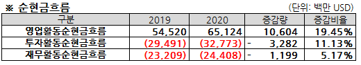 - 재산과 설비, 그리고 취득 대금을 지불 투자활동에 사용된 순현금은 주로 유가증권 순매입이 증가하여 2019년부터 2020년까지 증가함.
